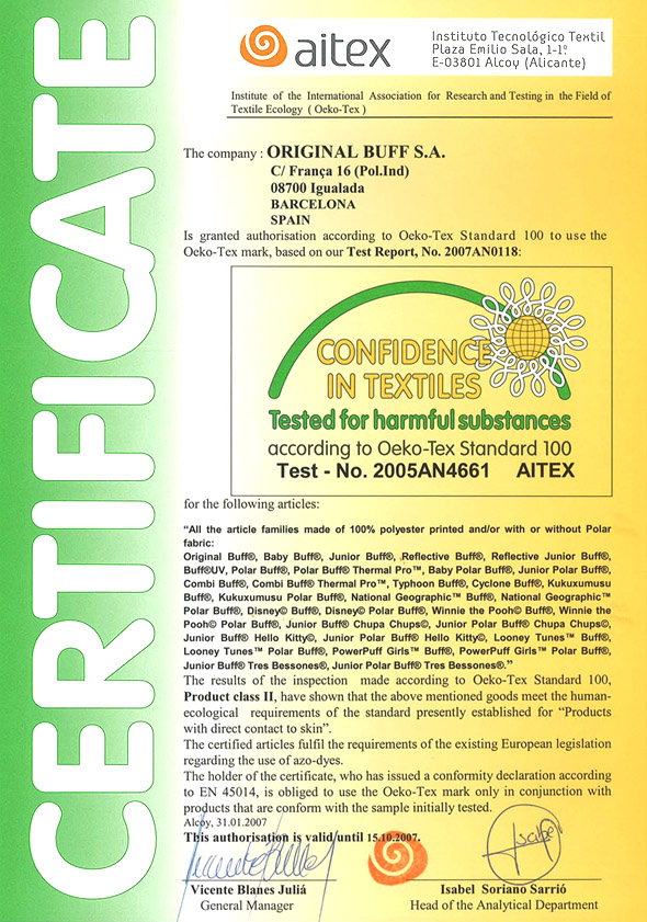당신의 버프는 안전 하십니까? 현재 시장내에는 "버프"와 유사한 수많은 제품들이 유통/판매되고 있습니다. 이중 "버프"의 이미지와 디자인, 사진등을 그대로 도용하거나 비슷하게 만든 제품도 있고 "버프(BUFF)"브랜드를 발음이나 철자를 비슷하게 만들어 혼돈을 주는 제품들이 버젓이 판매되고 있습니다. 여러분들은 이런 유사품을 그냥 구입하고 계십니까? 이런 제품들의 문제점이 비단 "오리지날버프"와의 혼돈만이 아닐 것입니다. 이런 저질의 저가 제품들이 과연 인체에 무해 한지 확인 해 보셔야 할 것입니다. 버프를 마스크의 형태로 많이 사용합니다. 태양빛의 자외선을 막기 위해, 찬바람을 막아 보온의 수단으로, 오염된 공기의 유입을 차단하기 위해....... 그런데 이렇게 자신의 피부나 호흡기를 보호하기 위한 제품이 과연 여러분을 보호 해 주는지? 인체에 바로 접촉 되어도 무해 한지 확인 해 보셨는지요? 버프스타일에 쓰이는 제품은 폴리에스테르계열의 화학섬유 제품입니다. 또한 그 위에 무늬를 프린트 하기 위해서도 화학성분의 잉크를 사용합니다. 제품에 묻어 있은 그 성분들을 여러분들은 바로 피부로 호흡기로 흡입하고 있을 수도 있습니다. 자신을 보호하고자 사용한 제품을 자신을 공격 할 수도 있는 것이지요. 이제는 유해성을 확인하여 보시기 바랍니다! "버프(BUFF)"의 모든 제품은 Oeko-Tex 100 연합회로 부터 친환경 소재 인증을 받았습니다. (Oeko-Tex Standard 100 (Oe는 원래 O움라우트)는 전 세계적인 섬유류에 대한 친 환경라벨입니다. 이 라벨을 가지고 있는 제품은 전세계적으로 유명한 15개 연구소에서 실험하고 보증하는 제품입니다. 이 라벨은 국제적인 트레이드 마크로서 마드리드 조약에 의한 법적 보호를 받고 있습니다.) 이 라벨을 가지고 있는 제품은 인체에 어떠한 위험 요소를 가지고 있지 않다는 것을 보증하며 전세계적으로 유명한 15개 연구소에서 실험하고 보증하는 제품입니다. 버프(BUFF)는 인체에 무해한 제품으로 여러분의 아웃도어 라이프에 작은 방어막이 될 것입니다. ![]() |