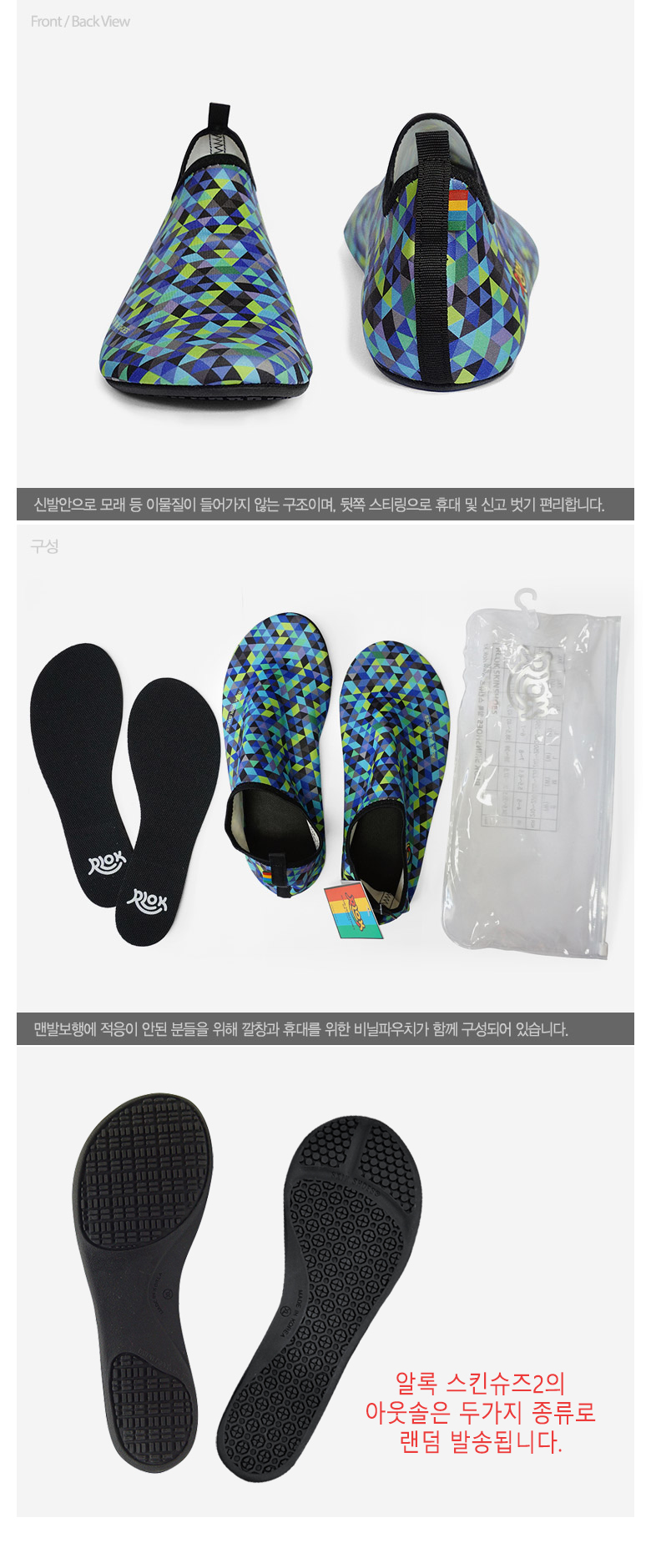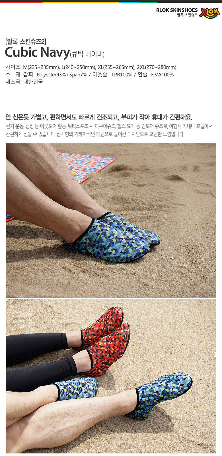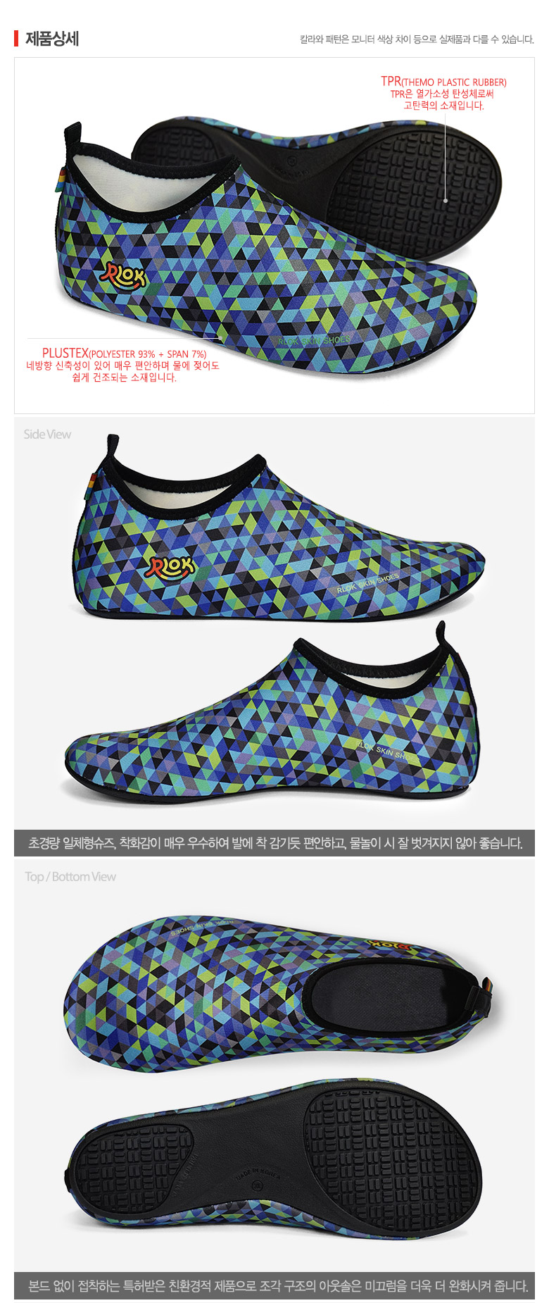 제품 소재 갑피: Polyester93%+Span7% / 아웃솔: T.P.R100% / 인솔: E.V.A100%